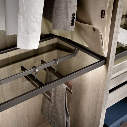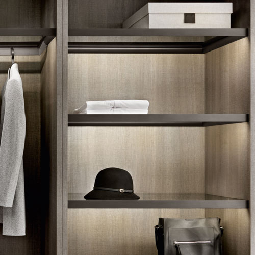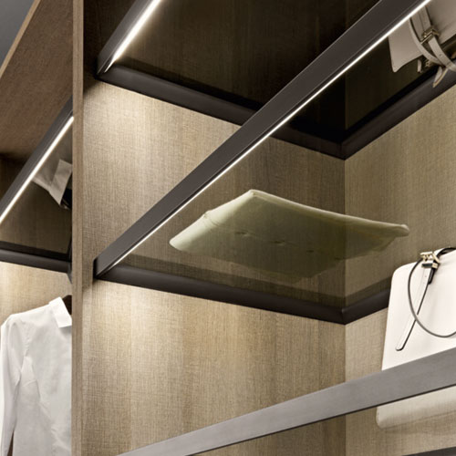 The illuminated shelves of the collection bring clothes and accessories to life; the wardrobe lights up and animates all the stored items.
