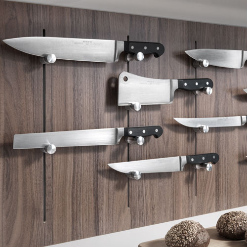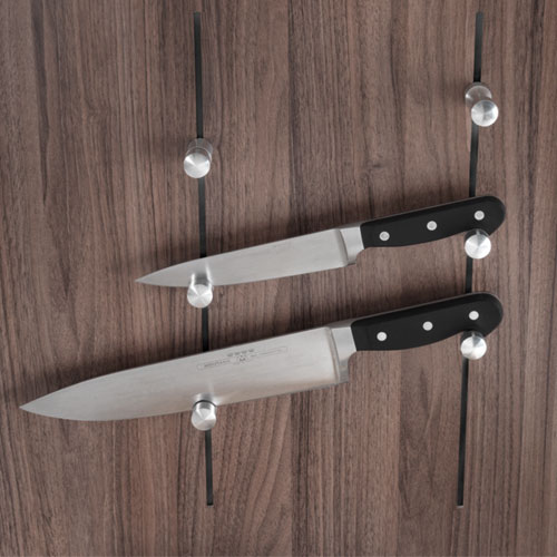 The Pin Knife system fixed on a wood panel presents a highly functional and secure storage system for cook’s knives.